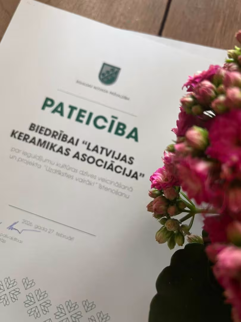 pagājušajā piektdienā Siguldas Jaunajā pilī saņemta pateicība no Siguldas novada pašvaldības par ieguldījumu kultūras dzīves veicināšanā un projekta "Keramikas svētki Siguldā "Atļaujies vairāk!"" īstenošanu. Pateicamies pašvaldībai par atbalstu, visu izstāžu norišu vietu darbiniekiem par atsaucību, sapratni un palīdzību, visiem tiem, kuri izstādes apmeklēja! Šo projektu atbalstīja VKKF, Latvijas vēsturiskās zemes. Vidzeme un Latvijas Laikmetīgās keramikas centrs.